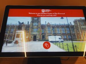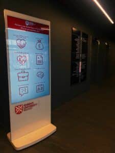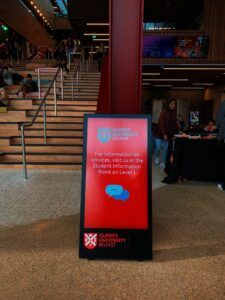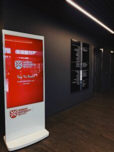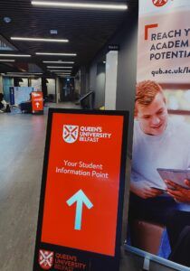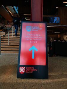 Queens SU designed a flexible social space as the heartbeat for campus life and as such need dynamic solution to provide access to key info on student facilities and important messaging. MAD deployed 4 x weatherproof battery powered portable A Boards, two vertical touch screens, and a horizontal touch screen with banded vinyl decals ensuring the digital signage fitted seamlessly into the vibrant student environment.